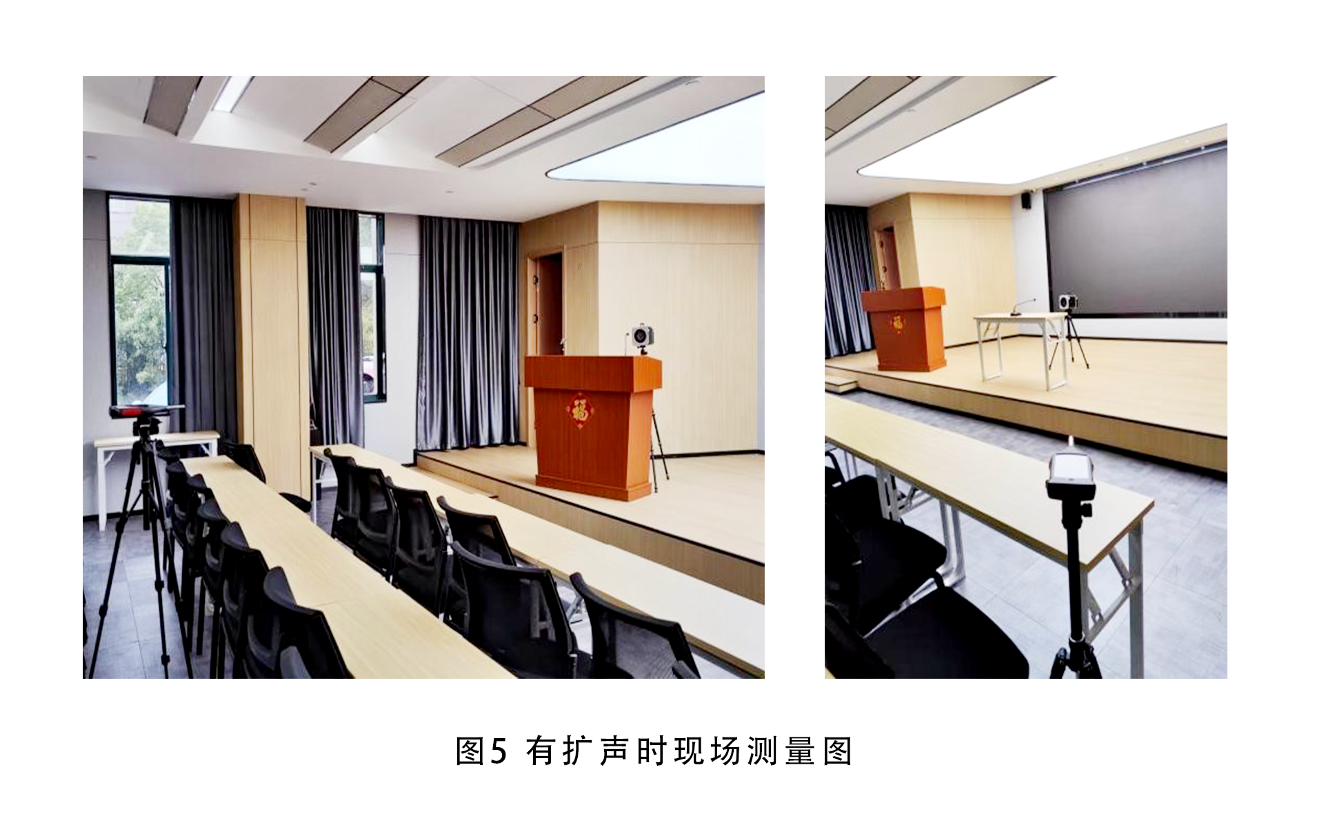 对于那些需要使用扩声传声器讲话或播音,再通过扩声系统播放的场所,测试信号由智能声源对着系统传声器发声。测试声源应置于正常说话距离,传声器的轴线指向正常发话方向;测试信号级与正常说话声压级相当,在距离声源0.5 m处声压级为66 dBA。在传声器输入处可用声级计监测该声压级以及测试信号频谱。测试声信号经扩声系统由扬声器系统播放,利用声级计可以按相关标准要求测量扩声系统和声学场所的各项指标。